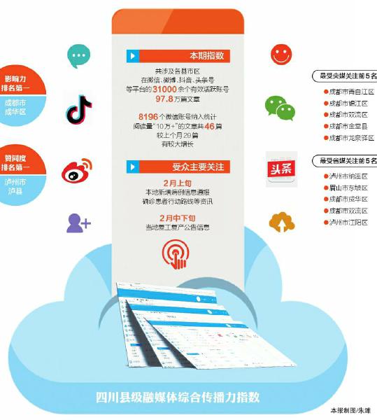 制图/甘翠 和上月相比,综合传播力指数前10名中有一半县市区是新面孔 在公开度指数前20名统计结果中,新入围县市区9个,占比45% 短视频成为公众获取防疫资讯、了解前线状态的重要方式 高关注度的防疫报道题材主要是疫情通报、一线战疫报道、复工复产信息以及防疫科普宣传等 本报讯(川报观察记者 毛竹菊)3月13日,四川县级综合传播力指数(2020年2月报告)发布。本期数据采集时间段为2020年2月1日至29日,涉及四川180多个县市区在微信、微博、抖音、头条号等平台的3.1万余个有效活跃账号、97.8万篇文章。 报告发布了县级综合传播力、影响力、公开度、赞同度等指数,最受央媒和省媒关注前5名以及当月微信微博最热文章。2月份,四川县级综合传播力指数排名第一为成都市成华区。和上月相比,综合传播力指数前10名中有一半县市区是新面孔。在公开度指数前20名统计结果中,新入围县市区9个,占比45%。赞同度指数泸县排名第一,古蔺县、兴文县排名上升明显。 本期指数发现,新冠肺炎疫情报道成为覆盖全月的关注重点。微信公众号“10万+”稿件翻倍增长;短视频成为公众获取防疫资讯、了解前线状态的重要方式;微博方面,公安系统的县级官方账号传播力提升明显;头条号方面,检察院系统的官方账号较为活跃;高关注度的防疫报道题材主要是疫情通报、一线战“疫”报道、复工复产信息以及防疫科普宣传等。 四川县级综合传播力指数运用大数据技术汇总中央和省级主流媒体对各县市区的报道情况,对阅读量好的“爆款”产品进行批量分析处理,通过公开度、影响力、认同度等指标,结合省内各区域在央媒、省媒上的表现,以相应算法生成县级综合传播力指数,尽量客观呈现全省180多个县(市、区)政务类、个人类账号综合传播力现状及特点。自2019年12月起,指数报告每月发布一期,至今已发布3期。 |
